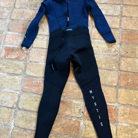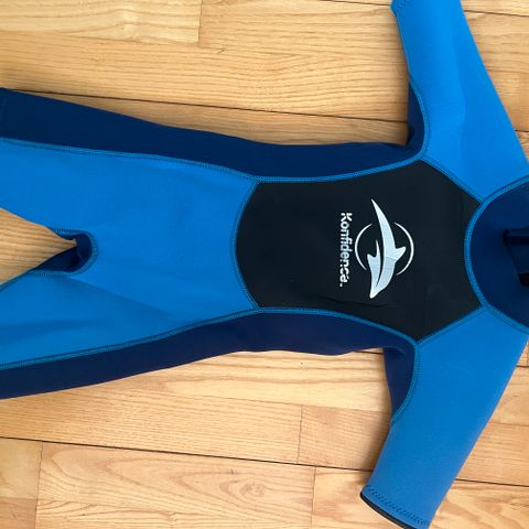 Neoprendragt str 6 år med korte arne og ben. Lang lynlås i ryggen, der gør den nemmere at få på. Sort og blå. Hjælper til at holde varmen i vandet. Jeg sender desværre ikke