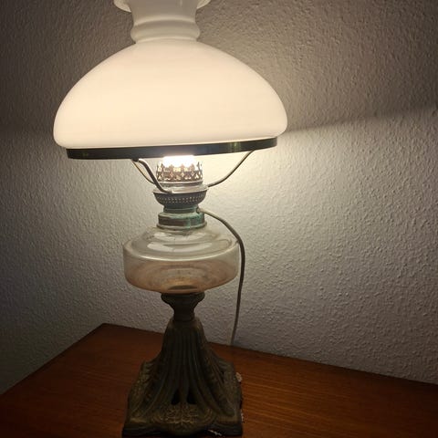 Fin gul glas petroleum lampeskærm, som er hvid indeni. Som ny uden skår. Diameter på 21,5 cm ved bund.