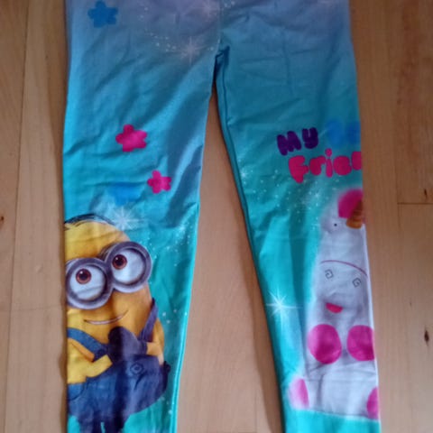 Str 110 Leggingsene har et gradientdesign, der skifter fra lilla øverst til turkis nederst. Det ene ben har et stort billede af en Minion, mens det andet ben har et billede af en enhjørning og teksten "My Friend". Der er også små blomster og stjerne detaljer spredt over hele designet.