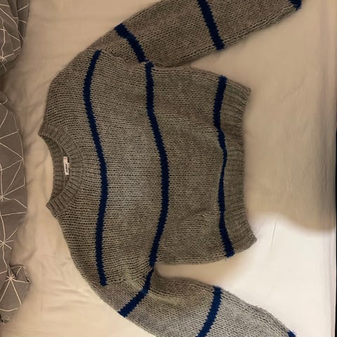 Bomulds strik med Sailor striber og to små lommer foran. Måler 79 cm i længden og 47 cm fra ærmegab til ærmegab. Meget fin stand.