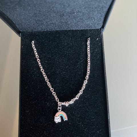 Du får en flettet hvid eller turkis læderhalskæde med for 20 kr. pr. vedhæng.
