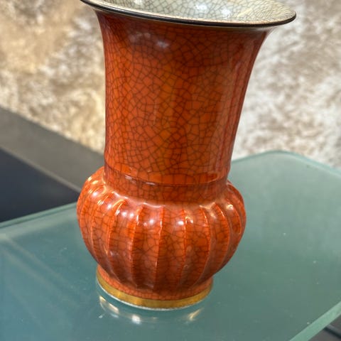 Flot gammel Royal Copenhagen vase og askebæger i orange/grå krakeleret glasur og guld.