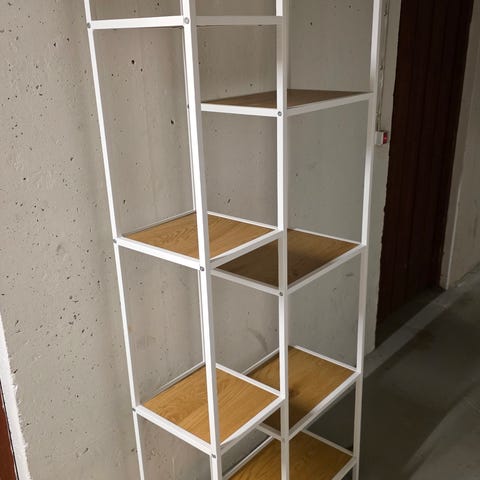 Moderne reol i hvid og sort træ. Reolen har flere hylder og er velegnet til opbevaring og udstilling af bøger, dekorationer eller andre genstande. Den passer godt ind i stue eller kontor med sit stilrene design.