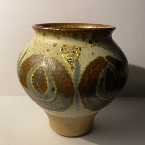 Lækker vase i persia glasur. Den er ikke signeret, men er ret overbevist om at den er af Michael Andersen. Den måler 17 cm i højden og 15 cm i diameter. Standen er fin, men den har lidt bristede glasurbobler.
