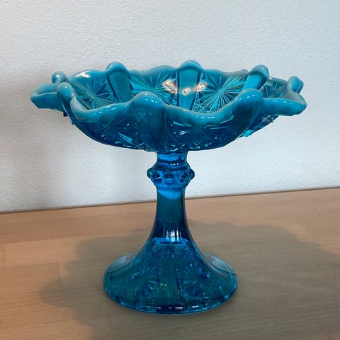Jeg er ikke lykkes med at identificere den endnu - fineste glasarbejde, oval skål på facetslebet stilk med stjernet fod - med oliver og stilliseret blomster på kummen.