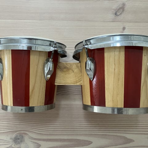 Se lige de her gamle bongotrommer som dem man husker fra musiklokalet i folkeskolen - de her fra Kalvehave. De er lidt patineret og har en skramme i skindet på den ene tromme. Men stadig skønne og mega retro til børneværelset.