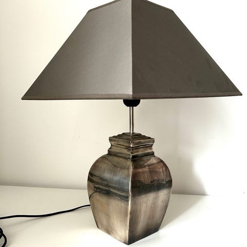 Sød lille bordlampe med råhvid aflang skærm.
