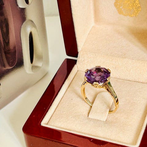 Stenen er en smuk dyb varm amathyst.