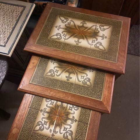 Smukke kakkelborde, med kakler i smukke farver og mønstre, de ligger løst på så man kan flytte rundt på dem, der følger to ekstra kakler med. Stort bord H 45 cm, B 50 cm, Lille bord H 42 cm, B 41 cm, sælges samlet for 1000kr