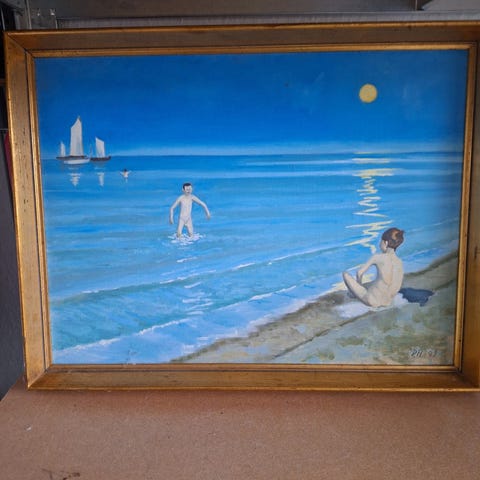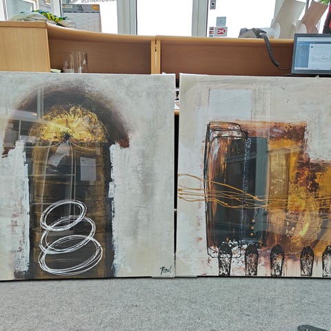 Abstrakt maleri med en farverig komposition, der inkluderer nuancer af lilla, rød, orange og gul. Maleriet er signeret PH og har en unik stil, der kan tilføje et kunstnerisk præg til ethvert rum. Velegnet til ophængning i stue, kontor eller galleri.