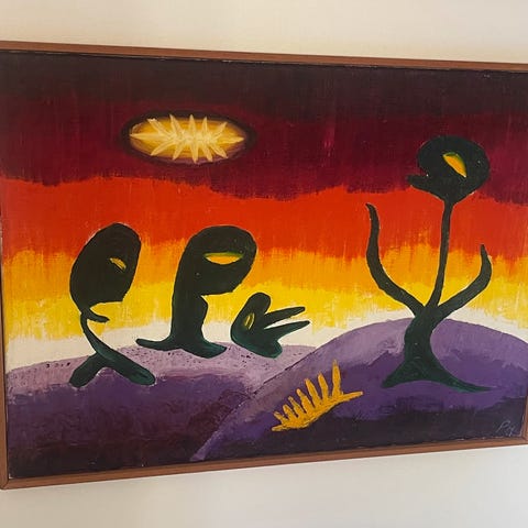 Abstrakt kunstmaleri med en farverig komposition, der inkluderer nuancer af rød, lilla, grøn og gul. Maleriet er indrammet og signeret af kunstneren med initialerne 'PH'. En unik tilføjelse til enhver kunstsamling eller som en dekorativ vægudsmykning.