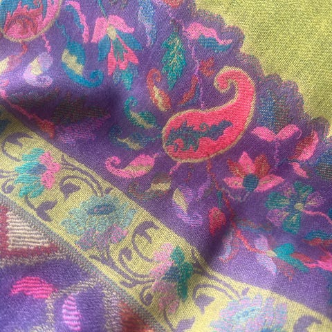 Ensfarvet, kvadratisk tørklæde (145 x 145), i et mix af bomuld, uld og hør i farven café latte (meget lys brun i en varm farve - viser sig dårligt på billederne!), med farvede borter i kanten i mørkegrøn, orange, pink og oliven (se billeder). Tørklædet er let og tyndt vævet. Købt i butikken Samarkand, på Østerbro for 599 kr. til en bestemt kjole, men farven var “lige ved siden af”, så aldrig brugt. Kan også bruges som pyntesyg.