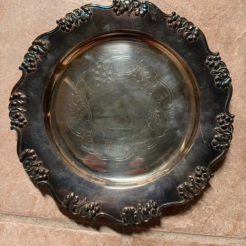 Vintage dekorativ tallerken i sølvplet med udsmykket kant. Tallerkenen har et antikt udseende med detaljerede mønstre, der giver den et klassisk og elegant look. Ideel som dekorationsgenstand eller til samlere af antikviteter.
