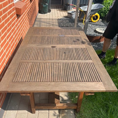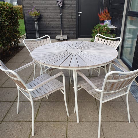 Havebord og 6 stole. 4 stole i ok stand 2 lidt slidte. Bordet er teaktræ med stålstel.