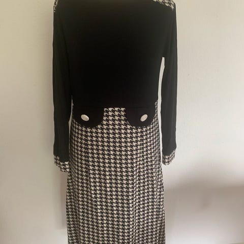 Model Karins, Formula One. Sjov og anderledes ‘formel 1 kjole’ med hæklede biler og referencer til sort/hvid ternet flad. Brugt få gange, så standen er som ny. Skjult sidelomme. Blød og behagelig at have på. Trækkes over hovedet. Længde fra nakke til kant: Ca. 100 cm. Viskose og elastan. Købt på udsalg til 910 kr. sælges for