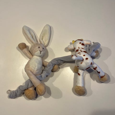 Barnevognskæde fra Diinglisar / Teddykompaniet. Spændes let fast til barnevogn med de trekantede hæfter. Der er raslelyd i koen. Søde dyr der kigger ned til barnet når det ligger i barnevognen. Mus og ko. Trænger til en vask da begge dyr er lidt nusset og måske har været en tur på jorden. Fejler ikke noget og kan let bruges mange flere år. Fra ikke ryger, parfumefri og dyrefrit hjem.