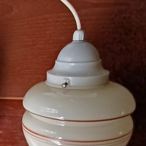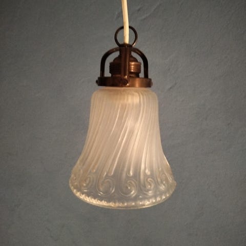 Fin pendel i hvid opalglas med blomstermotiv og messing top, højde 38 cm, uden skader eller skår, i pæn stand