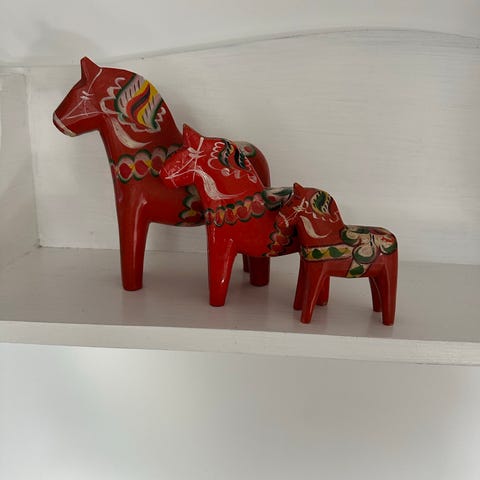 Nils Olsson Dalar heste træfigurer i rød og sort. Disse traditionelle svenske heste er håndmalet og lavet af træ, hvilket gør dem til unikke dekorative genstande. De er velegnede som pynt i hjemmet eller som en del af en samling af skandinavisk kunst.