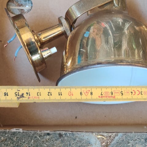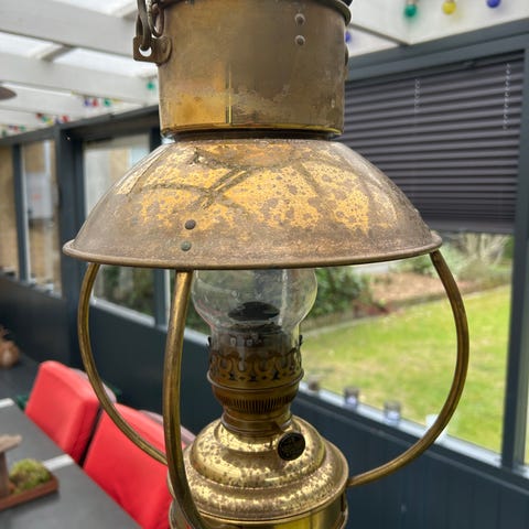 Jeg har 2 stk. olieskibslamper i messing, fremstillet hos GV Harnish eftf., grundlagt 1842. De er nummererede med nr. 46564 og nr. 46265. Fuld højde er 35 cm og diameter på kuplen er 14 cm.