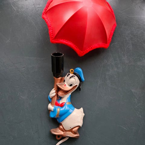 Gammel lampe/ børnelampe, h incl skærmen ca 36 cm. Virker fint, den er lidt løs i selve “ pinden” der holder pæren, men den skal bare trykkes på plads, tænker den er gået op i lodningen. Ingen betydning funktionen og når den først hænge. Det er en gammel sag.