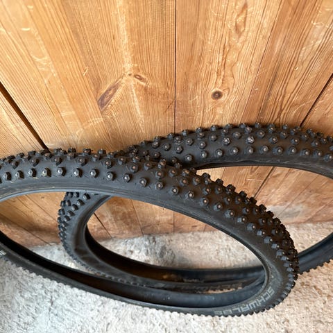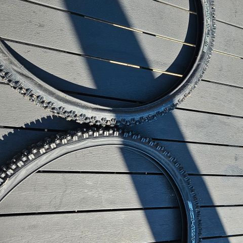 Jeg sælger mine Schwalbe, Ice spiker dæk til en mountainbike på 26" dæk. Dækkene er ubugte