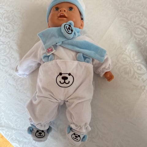 Baby Born Tilbehør Sæt inkluderer en hvid hagesmæk med et bamsemotiv og en matchende ble. Sættet er designet til new Born dukker. ( har 2 sæt) Pris pr sæt