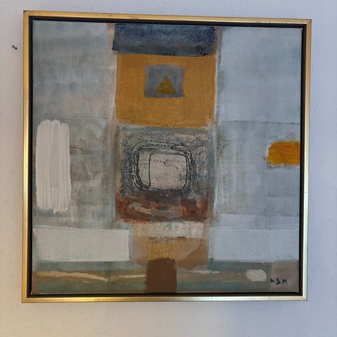 Abstrakt maleri indrammet i en rektangulær ramme. Kunstværket domineres af blå og grønne nuancer med røde og hvide detaljer, der skaber en dynamisk og levende komposition. Signeret