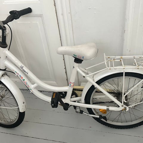 Vores datter voksede alt for hurtigt og kan ikke længere passe sin cykel, så hvis I står og mangler er den klar til en ny ejer. Hvid og Lilla pigecykel med kurv. Str. 20” ny pris 2100 kr. nu 450. Kr. note - bagdækket er desværre flat, så du skal have mod på selv at fixe det, da jeg desværre ikke er så handy.