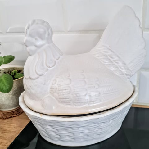 I kraftig metaltråd. Hul øverst i midten og med hanke. Du kan loppesjoppe den for 90 kr.