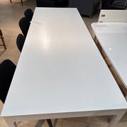 Lækkert hvidt højglans spisebord m tillægsplade på ca 50cm. Bordpladen er unik tyk og måler ca 190x90 cm, så m plade ca 240cm. Har et mærke på bordpladen, se billedet, samt almindelige brugstegn, deraf prisen.