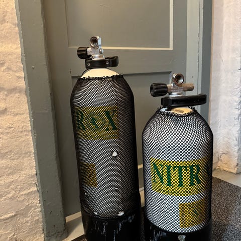 3 flasker og dykke grej og dragter