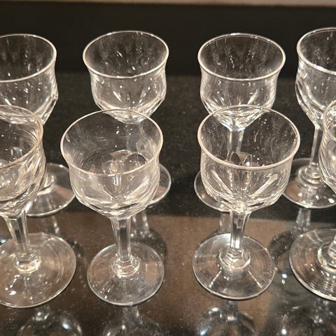 8 stk grønne glas 13cm, 9 stk hedvin glas 11cm og 9 stk snapseglas 11cm. Alder ukendt, men min mor købte dem i et dødsbo ca 1967. Har stort set aldrig brugt dem. Rødvinsglassene på foto er solgt.
