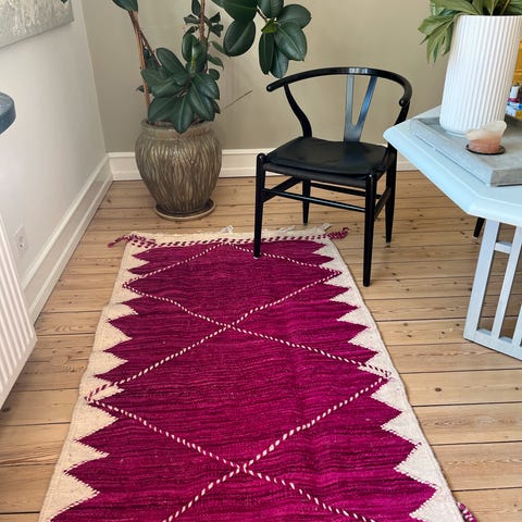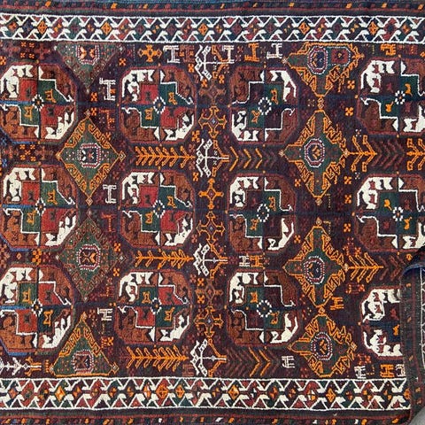 115 år gammelt syrisk kurdisk vægtæppe, certifikat medfølger som sagt. Har oprindeligt været en bryllupsgave (skabt for at vise, at familien havde en datter, der kunne væve, fortalte forhandleren). Tæppet var tiltænkt at hænge vandret over brudeparrets seng. Tæppet er ifølge en kender af mellemøstlige tekstiler usædvanligt. Det er også meget smukt og vil let kunne indgå i en moderne nordisk boligindretning.