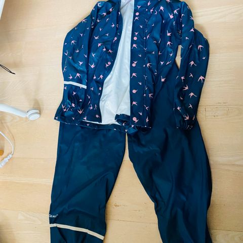 Regnjakke og bukser Celavi str. 104. Regntøjet er blevet vasket på 30°, skal nok lige have en tur på 40° som det kan tåle, for at få det sidste snavs af. Pæn stand, der har stået navn i. Ann. nr. S1539