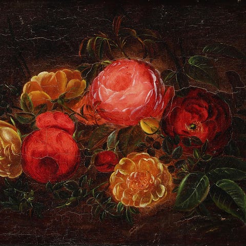 Blomstermaleri, I.L. Jensens Skole, olie på plade, fin stand, lille trykskade øverst til venstre, se fotos, lysmål 27 x 22 cm, med forgyldt træramme 34,5 x 29,5 cm.