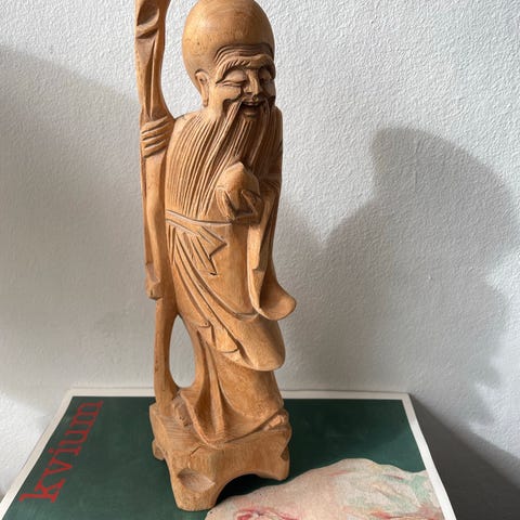 Fin og dekorativ lille Buddhafigur, Håndskåret i flot lyst træ med farvespil. kender ikke træsort, men det har en god vægt tyngde. Vintage og unik.