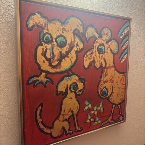 Oliemaleri, Hanna Thorup, motiv: Dyr, stil: Modernisme, b: 84cm h: 94cm, Maleri olie på lærred af Hanna Thorup dateret 2001 motiv: Hygge - Tenerife 94x84vm. lb4