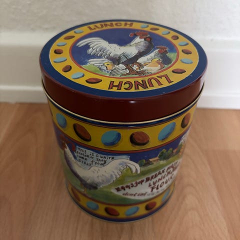 Rigtig flot lyseblå dåse som kun er brugt meget lidt. Den har to små tryk (buler) ved bunden, men er herudover meget velholdt. Dåsen måler ca. 22 cm i diameter og 13 cm i højden. Motiverne er farverige bondegårdsdyr; kaniner, grise, får, høns og køer. Se billeder