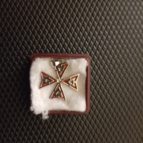 Malteserkors, købt i 1980 hos Francis Meli jeweller på Malta. Ø: 3,2 cm. Der er sølvstempel bagpå, men jeg kan næsten ikke læse det. Så vidt jeg kan se, er der et symbol først, derefter 925, igen et symbol og lidt uden for rækken: BF. Det har ikke været brugt meget.