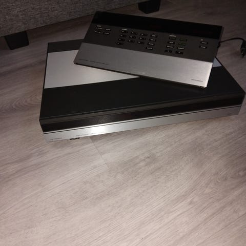 Beomaster 5000 mester Control System i sort farve. Dette system har et stilfuldt design med en række kontrolknapper og skærme, der giver mulighed for præcis justering af lydindstillinger. Velegnet til dem, der ønsker en klassisk og funktionel lydstyring fjernbetjening med flere knapper til styring af lydudstyr