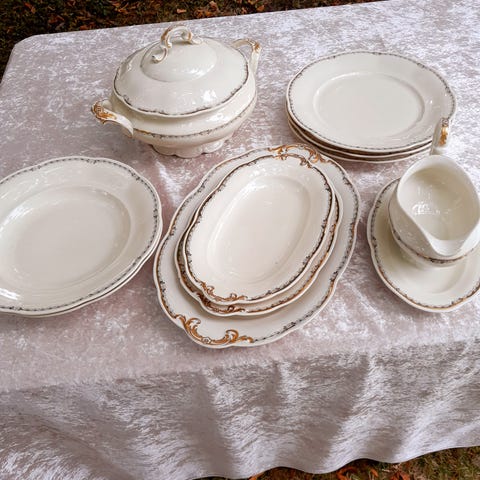 Smukt og enkelt stel fra Bavaria, det hedder Tirschenreuth og er i hvidt med fin grå minimalistisk blomsterranke i kanten. Der er mange smukke fade og det vil være fint at mixe med andet hvidt porcelæn.