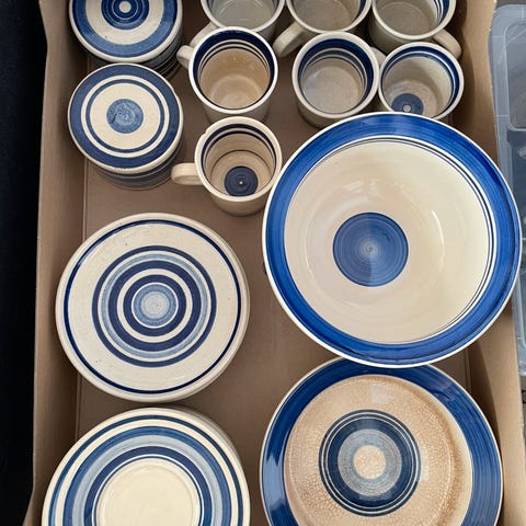 Store kopper (tekopper), underkopper og desserttallerkner samt skål fra Sebastian Keramik. Uden skår. Nogle af desserttallerknerne har ubetydelige krakeleringer i glasuren, se fotos