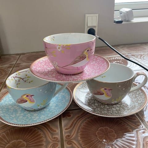 4 Røde og 4 Blå, med tilhørende underkopper fra IKEA ca år 2008, de er velkendte fra flere tv serier.