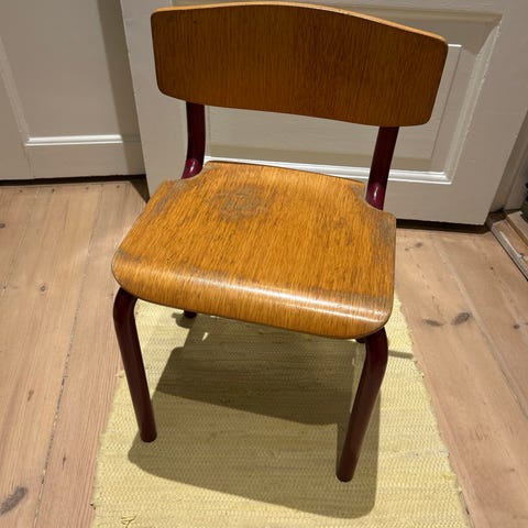 En lille skøn stol til ‘børnehave’barnet i autentisk firserstil! Stolen er super robust og klar til et nyt hjem. Har brugsspor hvilket kan ses på fotos.