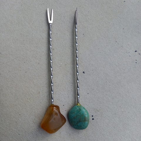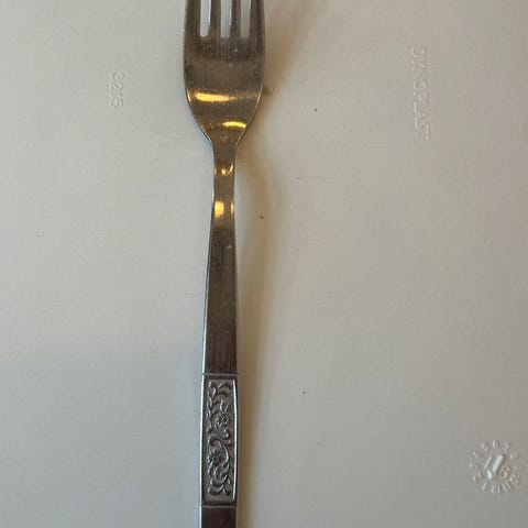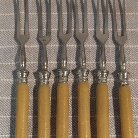 5 store retro gafler + 1 lille retro gaffel. Der er mønster på skaftet som ligner blomster. Der står “Stainless Steel Singapore” bagpå.