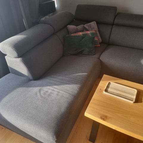 Betrukket med blødt og slidstærkt gråt stof, og sofaen er i generelt god stand, med kun et par mindre katteskrab i stoffet – ikke særlig synlige.