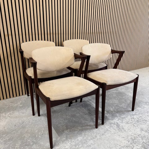 Kai Kristiansen stole i palisander.Der er 8 stk og prisen er pr stk.Stolene er ny polstret i sort semianilin læder og efterset i alle samlinger.Står med minimal og helt almindelig brugs slitage på stelletSE DEM I VORES SHOWROOM I ESBJERG STORCENTERADD : GL VARDEVEJ 230 6715 ESBJERGÅBENT HVER TORSDAG FRA KL 14 -17.30Se vores hjemmeside for andre møblerhttps://www.design-classic.dk/Vi leverer til kantsten. Vi kan i særlige tilfælde tilbyde op bæring mod ekstra betalingMvh Kirsten og Bo