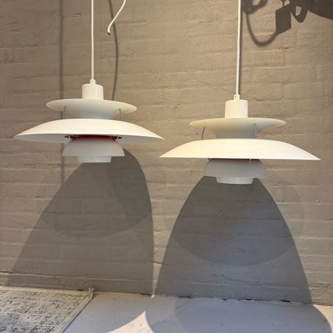 Poul Henningsens klassikerPh 5 pendlen i hvidKommer med almindelig brugs slitageHar hængt samme stedOriginal ledning og med el spare pære iLampen virkerDer er to stk og prisen er pr stkSE DEN I VORES SHOWROOM I ESBJERG STORCENTERADD : GL VARDEVEJ 230 6715 ESBJERGÅBENT HVER TORSDAG FRA KL 14 -17.30Se vores hjemmeside for andre møblerhttps://www.design-classic.dk/Vi leverer til kantsten. Vi kan i særlige tilfælde tilbyde op bæring mod ekstra betalingMvh Kirsten og Bo