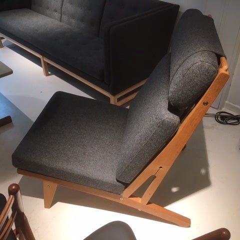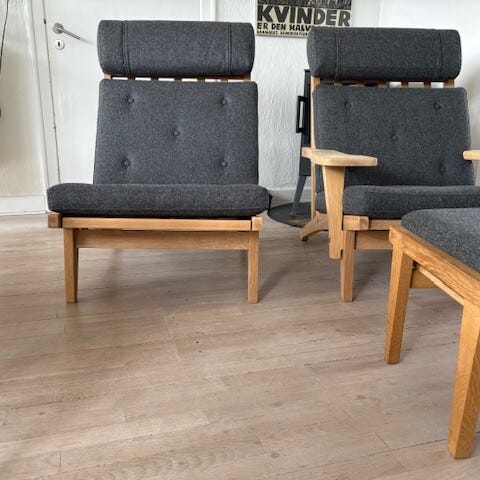 Wegner Ge 375 i ny malet retro orange wegner farve.Der findes ikke mange af dem derudeStolene kommer lige fra professionel maler og venter kun på at hynderne kommer i.De er pt ved polster og bliver lavet i lys og koksgrå uldDer er nye gjorder i og de er restaureret med respekt for historienStole kan laves til en 2 pers sofa eller de kan købes enkeltvisSE DEN I VORES SHOWROOM I ESBJERG STORCENTERADD : GL VARDEVEJ 230 6715 ESBJERGÅBENT HVER TORSDAG FRA KL 14 -17.30Se vores hjemmeside for andre møblerhttps://www.design-classic.dk/Vi leverer til kantsten. Vi kan i særlige tilfælde tilbyde op bæring mod ekstra betalingMvh Kirsten og Bo