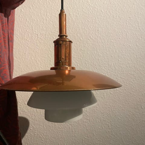Poul Henningsen. PH 3 ½ -3 pendel. Jubilæums 120 års udgave udført i begrænset oplag. Håndlavet overskærm af kobber, mellem og underskærm af mundblæst opalglas, fatningshus af ubehandlet kobber. Står stadig i den originale emballage.Har aldrig været pakket ud